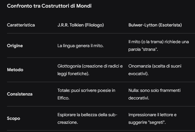 Tolkien usava la filologia come fondamenta del suo mondo (prima la lingua, poi la storia); Bulwer-Lytton usava la "pseudo-filologia" come carta da parati per dare un tono antico a una stanza moderna.