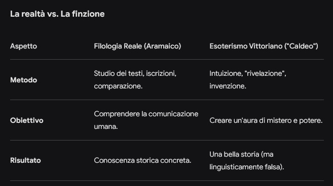L'inconsistenza di cui parlavi prima non era un errore ai loro occhi, ma una prova di superiorità. Se una persona comune (il "profano") faceva notare che in aramaico "sole" si dice shemsha, l'esoterista rispondeva che quello era solo l'aramaico "volgare", mentre lui possedeva il significato "occulto". È un meccanismo psicologico imbattibile perché non può essere smentito dai fatti.